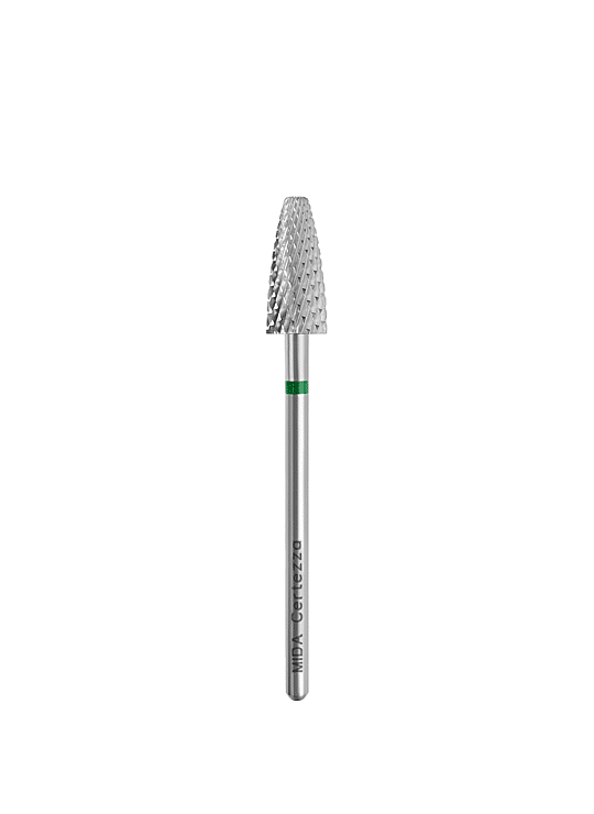 Cette fraise en carbure avec anneau vert possède une tête conique plus large qui permet de retirer plus de produit en un seul passage. La pointe arrondie garantit une sécurité supplémentaire : vous travaillez de manière puissante sans risquer d’abîmer la peau.