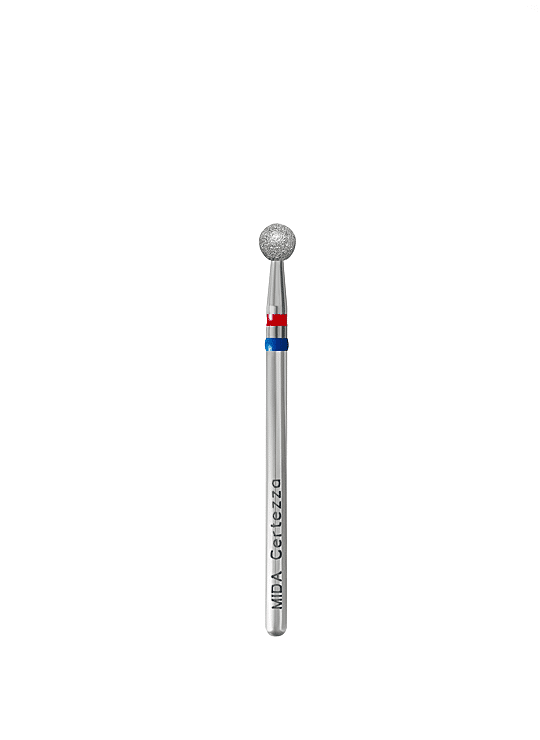 Une fraise en forme de boule est idéale pour peaufiner le contour des cuticules lors d’une manucure à sec – et cette version avec une bague rouge-bleue et un grain moyen-fin offre le bon équilibre entre efficacité et douceur.